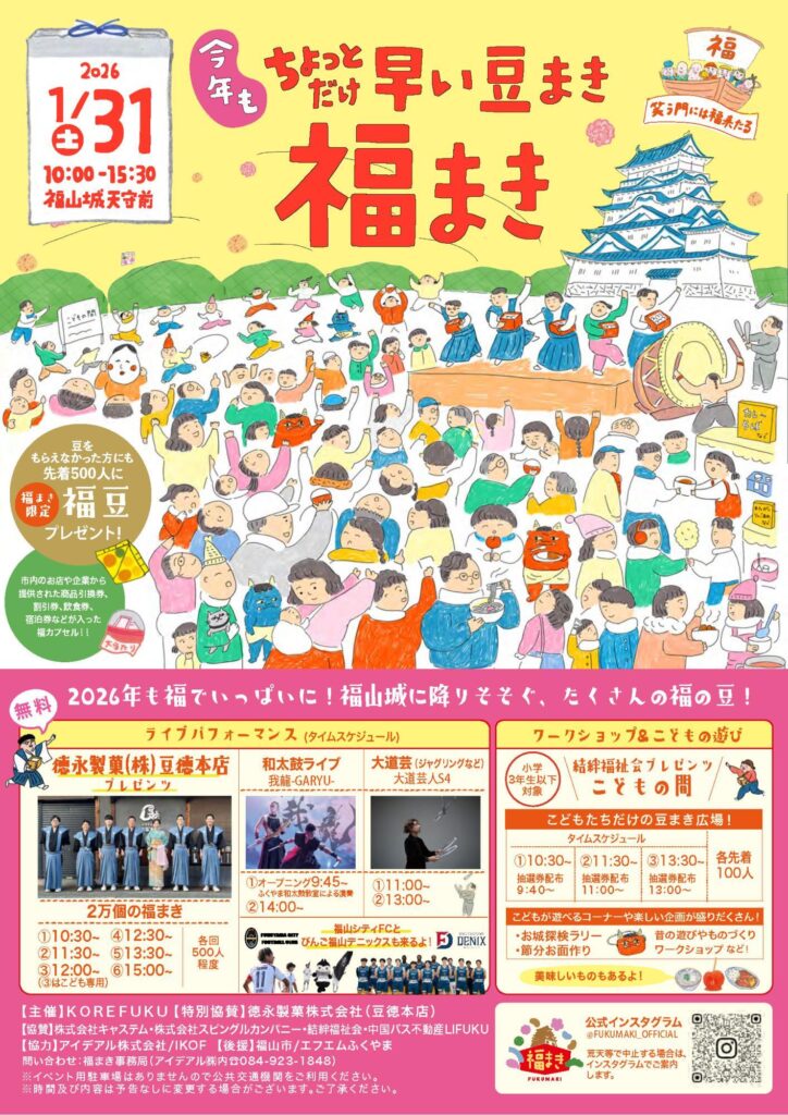 ブログ28 Jan 20261/31(土)福山城天守前で2万個の豆まき!「福まき」 jjhiro32 PV約1分026年1月31日(土)、節分本番を前に、一足早く一年の幸せを願う恒例のビッグイベント「今年もちょっとだけ早い豆まき『福まき』」が福山城天守前で開催されます! 今年は合計2万個もの豆が舞う「福まき」に加え、迫力あるステージパフォーマンスや、子ども向けの特設広場など、例年以上にパワーアップした内容となっています。 jjhiroBruteWebServiceFollow :駅前情報January 28, 2026福山カキ祭り2026/2/15(日)駅前情報January 11, 2026【ふくやま城下冬まつり】ショップ情報December 24, 2025【ニューキャッスルホテル】広島東洋カープ 新井貴浩監督 新春トークショー駅前情報December 17, 2025RCCラジオ公開録音「それ聴け!Veryカープ!」福山城November 23, 2025過去最大規模>肉の祭典『福肉祭2025』が福山城にて2日間開催!福山城November 17, 2025人気店、全25店舗 【 初開催! 九州のうまいもん大集合 九州屋台飯パーク 福山城】jjhiroの記事一覧